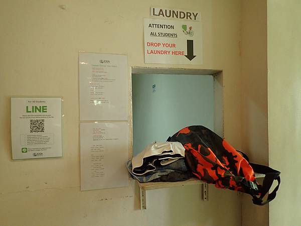 洗手間旁邊有一個小櫃檯,那是住宿學生,可以把衣服拿到那個櫃檯,有工作人員會幫學生們免費洗衣服,洗衣服務還包含烘乾,全部弄好,完整的給學生,學生可以專心讀書不用擔心衣服還要自己洗的問題。