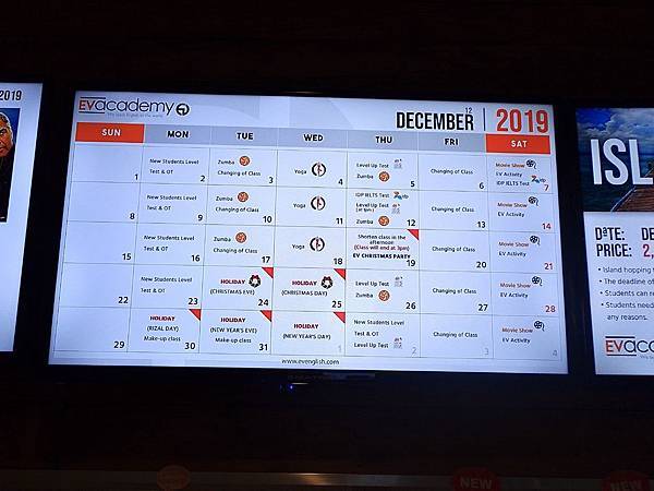 EVacademy這間位在菲律賓宿務的語言學校,有校車,可以接送學生,也是辦活動會用到的校車,學校裡面也會時常辦很多很棒的活動,都辦在週末(週五或週六)而且活動都很受學生歡迎,因為我們去的時候是快到聖誕節,在12月初,他們就有介紹他們再有一年跨年跟聖誕節時有辦泡泡趴,也有把那場活動的影片給我們欣賞,看到所有參與人很多也很快樂,發現這間學校除了注重學生學習外也會注重一些學生的娛樂還有課後的一些休閒,這間學校超新,超美,超讚,這間學校,我覺得是我參觀到現在我覺得最吸引我的學校,讓我覺得可以把EVacademy放在第一名也不為過。