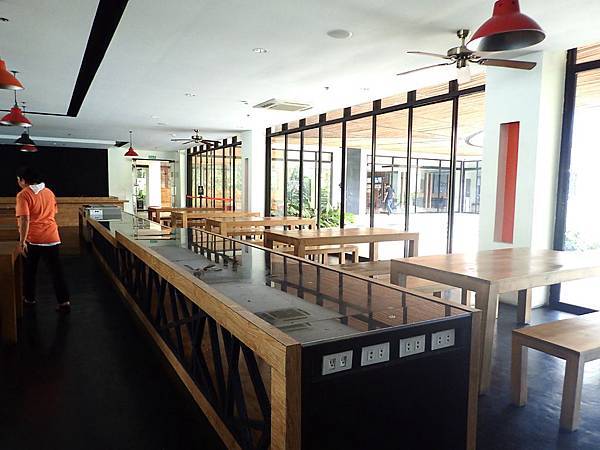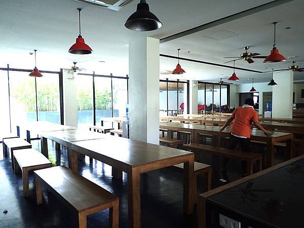 這裡是學生用餐的地方,這裡提供學生吃到飽的餐廳,桌椅都屬長方形,大家一起坐在一起吃飯