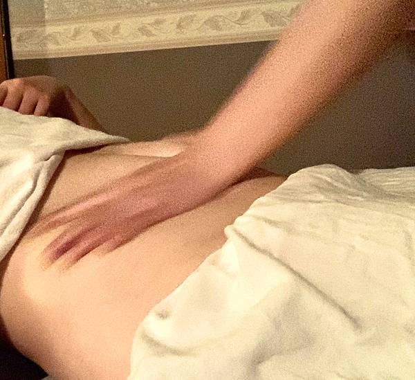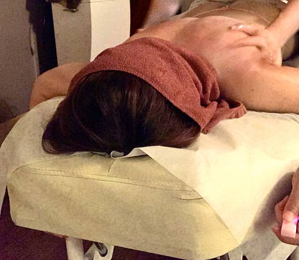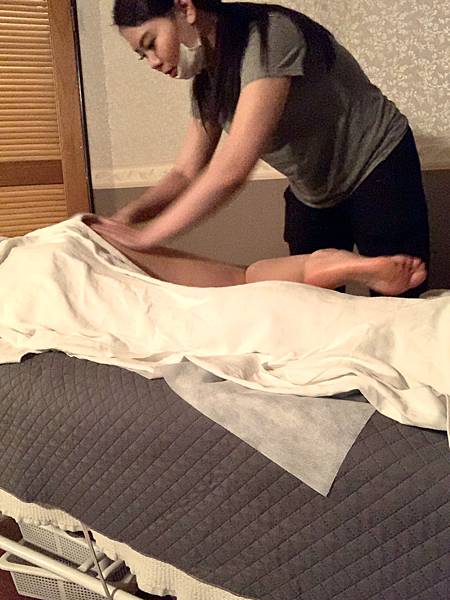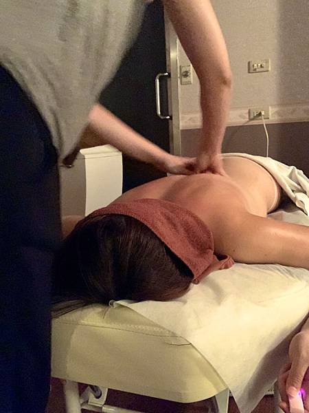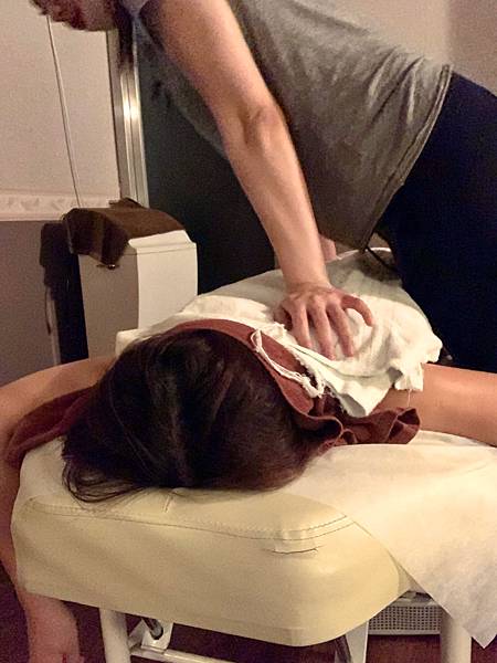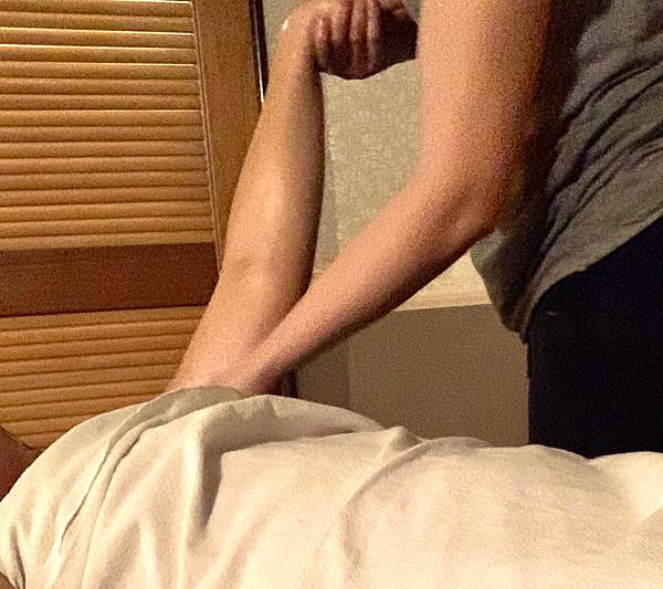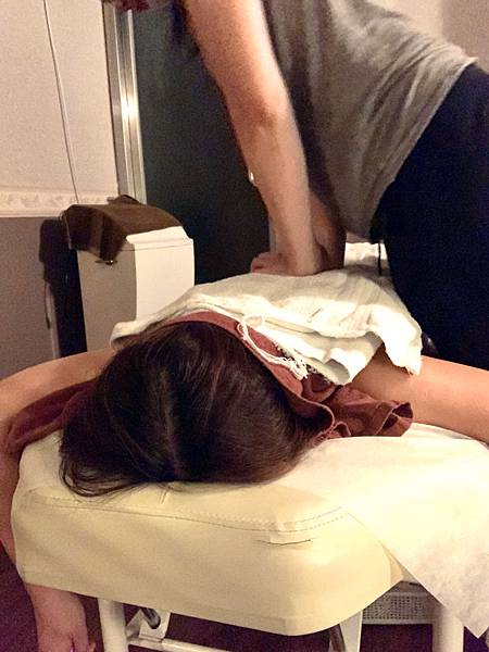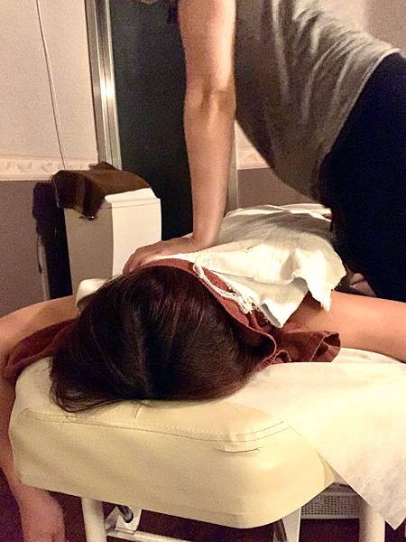 按摩完後,會在幫Jessica用毛巾做大範圍的拉筋,讓背部舒緩。