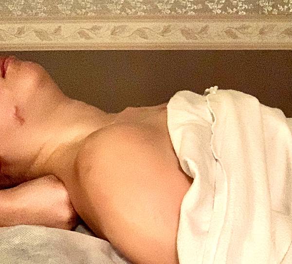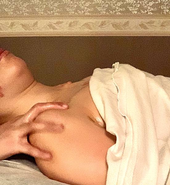 做完後面以後,前面也是全身的按摩,從胸部開始。