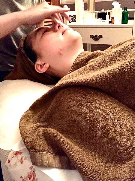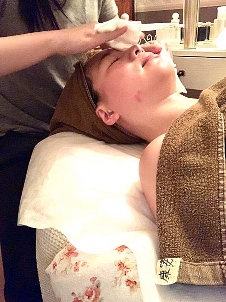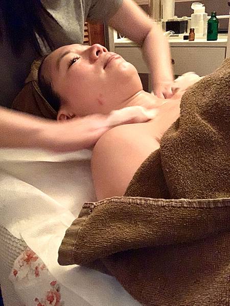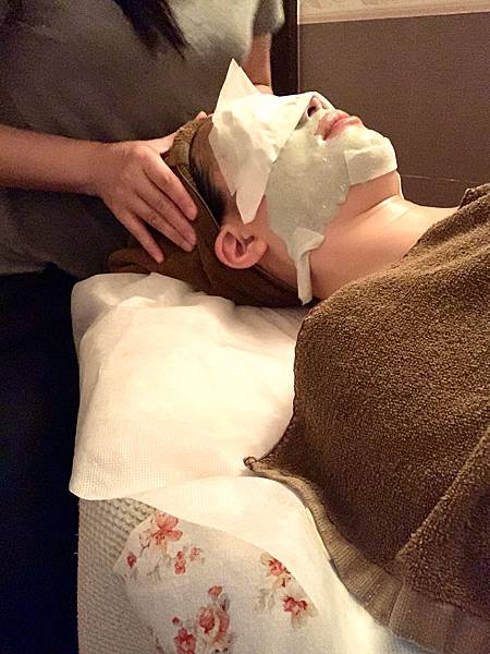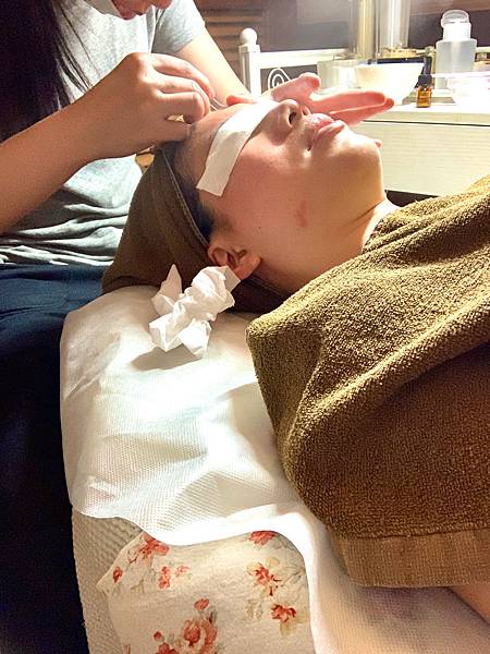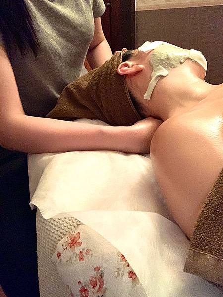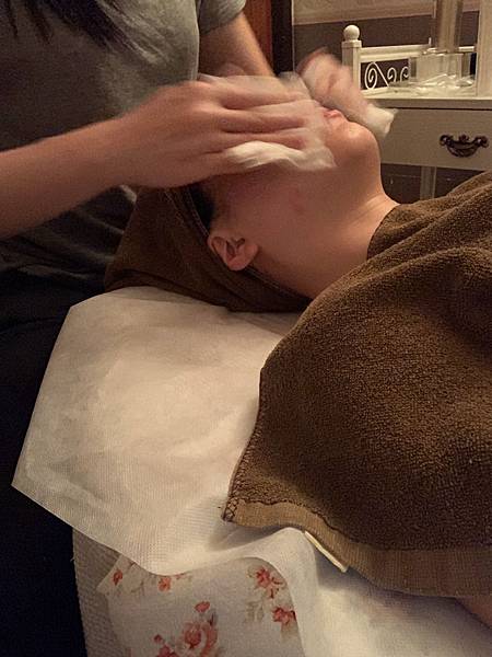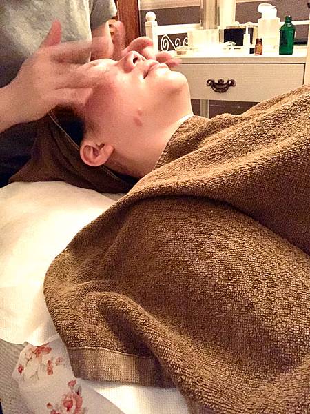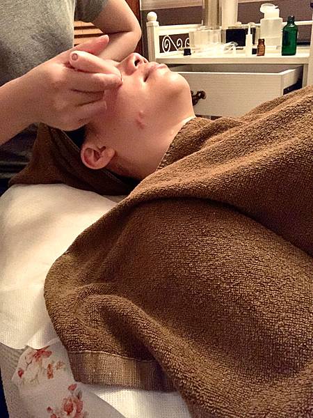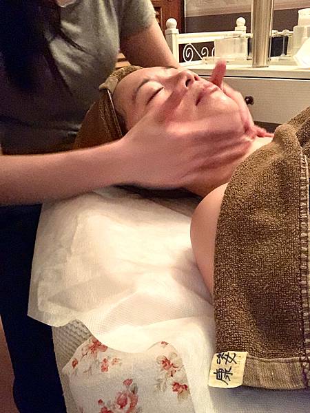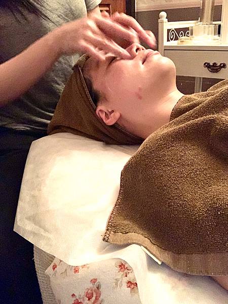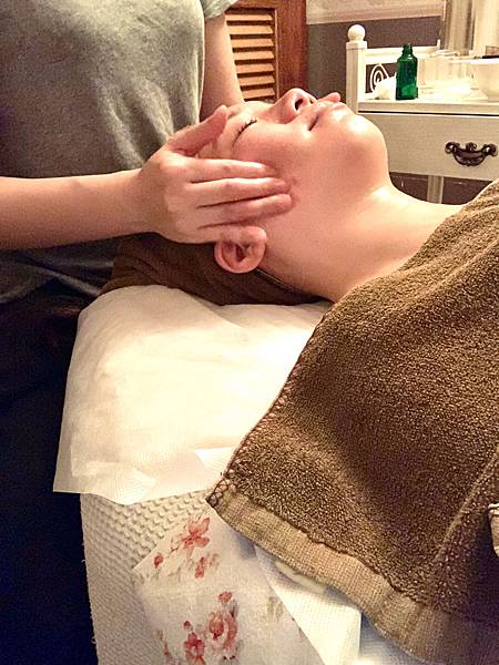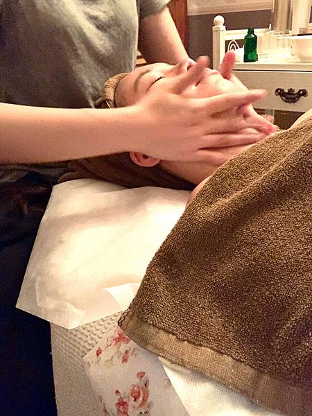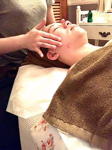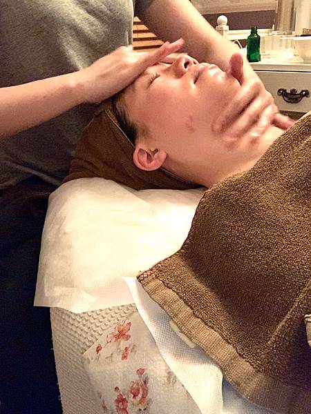 美容師臉部的精油保溼按摩也是走臉部筋絡的穴道位置,而且手法溫柔,勁道適中,臉部好舒服。