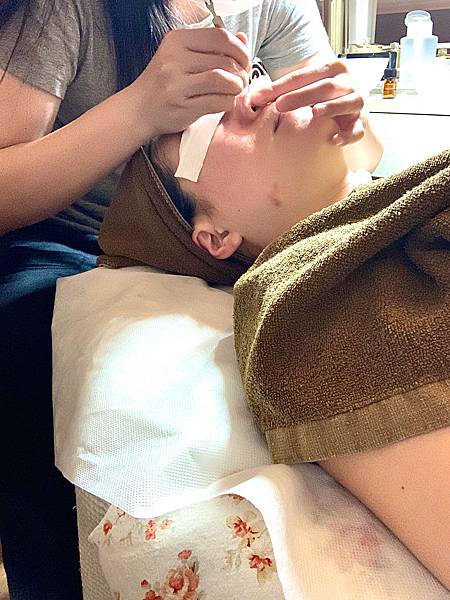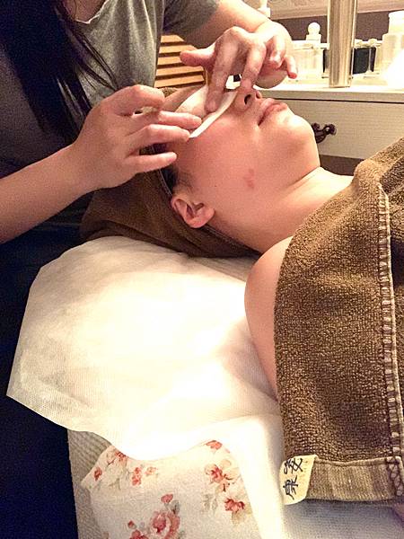 美容師開始仔細清除妳臉上鼻子還有兩頰的粉刺。