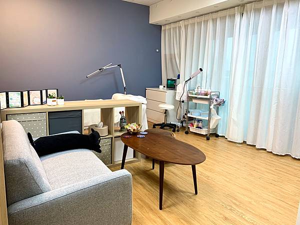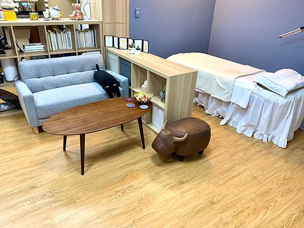 這裡的桌子跟沙發是闆娘跟客人諮詢與看客人膚質與諮詢服務的地方。