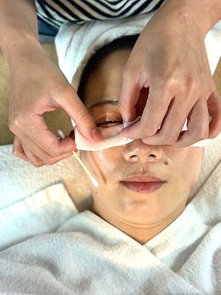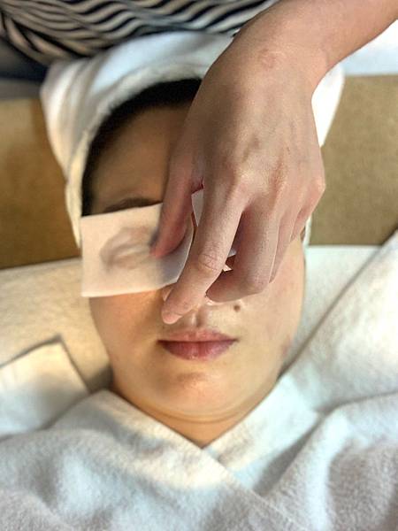 先從眼妝卸妝起,眼妝是使用眼唇卸妝液卸妝,闆娘使用的清潔品很溫和,雙眼在濕敷時都不會不舒服。