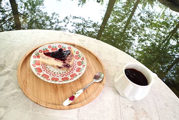 蛋糕和風民宿&和風食堂會依當季產出的水果請甜點師傅幫忙做當季蛋糕,現在剛好是桑椹的季節,這個蛋糕是桑椹起司蛋糕,咖啡是店家精選的咖啡。