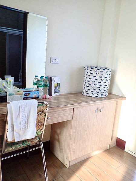 門左邊有梳妝台,檯上有洗髮精、洗面乳、沫浴乳之類的盥洗用具。
