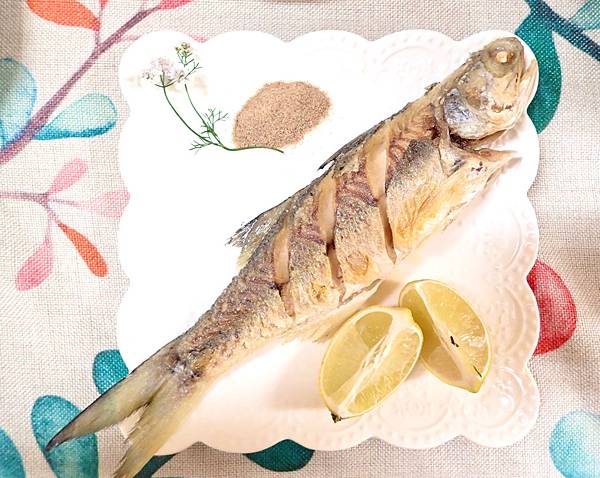 一隻魚,這隻魚煎的好好吃,搭配檸檬有一種檸檬香氣,旁邊有胡椒鹽,但是Jessica覺得這個魚吃原味就很好吃了,加檸檬更添香氣。