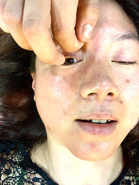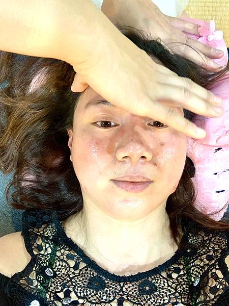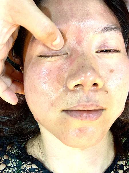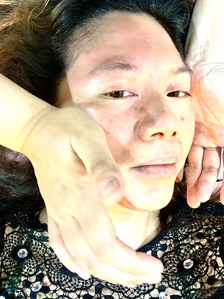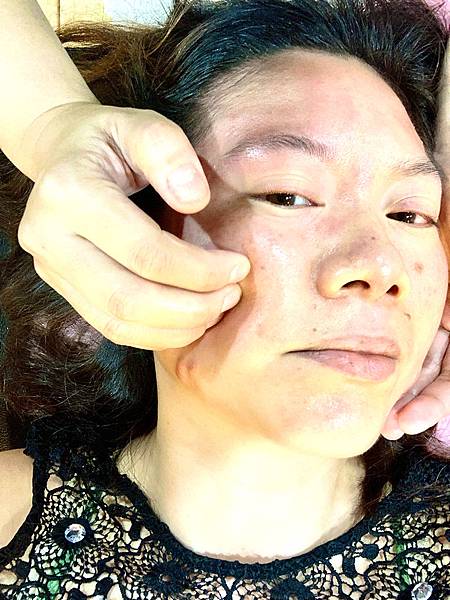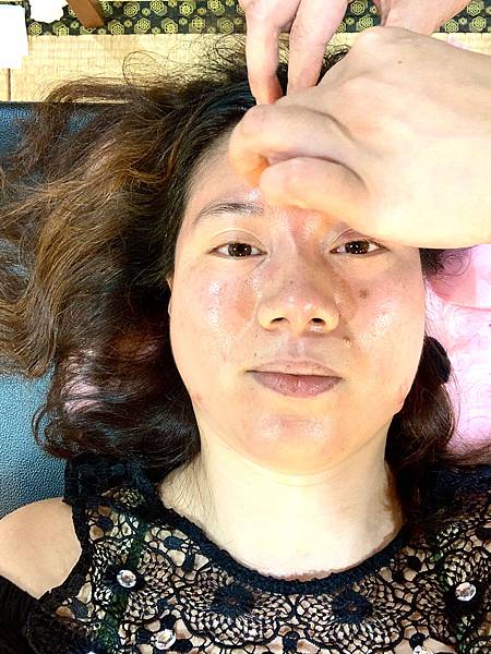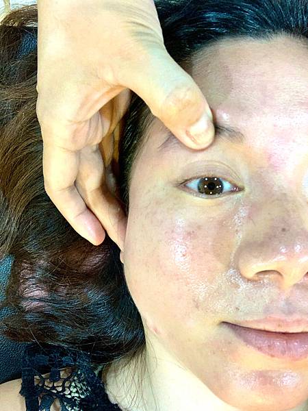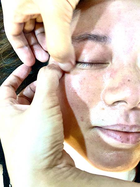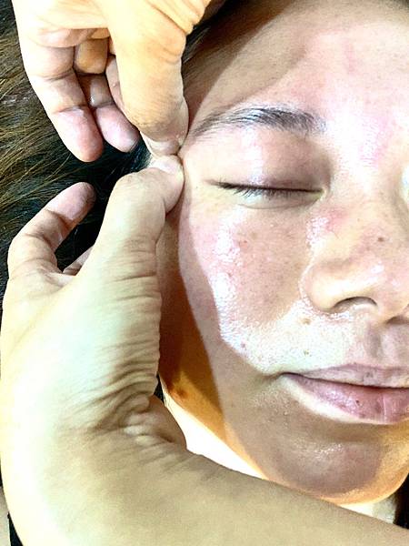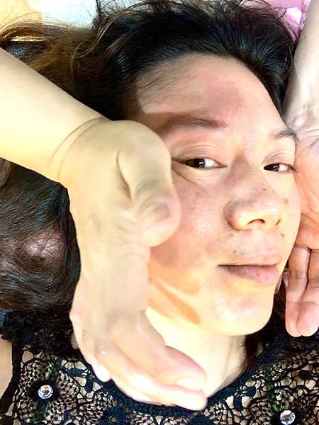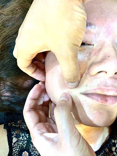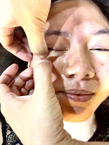 開始施作了,臉雕師會先幫我把汗水擦掉,記得來做臉雕的人一定要素顏,臉雕師會利用乳液做潤滑來幫我們徒手施作,會把臉上的妝用花。