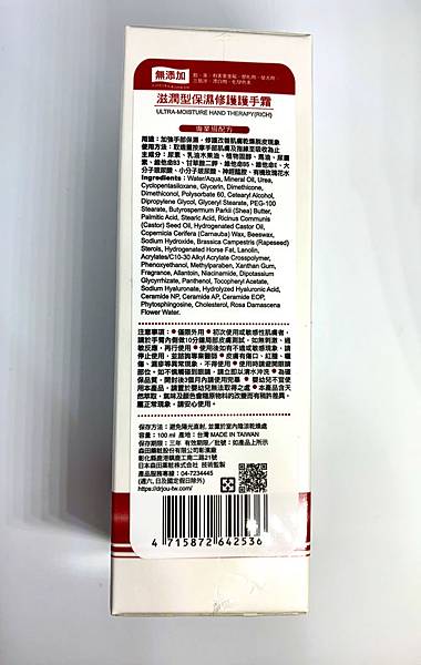 這個護手霜包裝顏色很美,整體的紅色,我真的覺得好美也很高級,外包裝是白色的底,紅色的字與黑色的字。