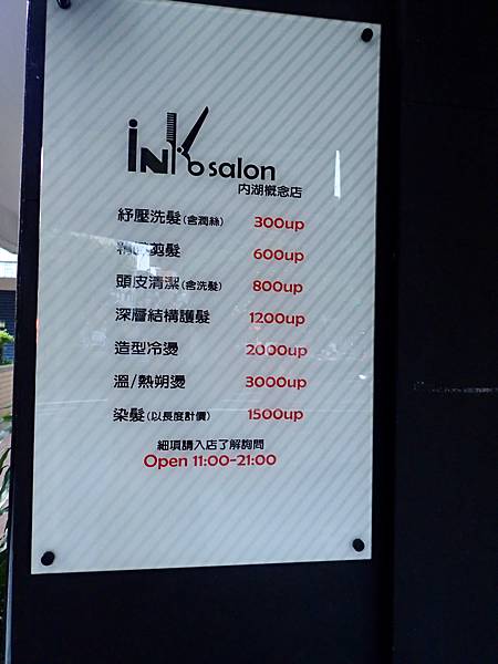Ink salon內湖概念店的營業項目與價目,也很清楚的在店外。