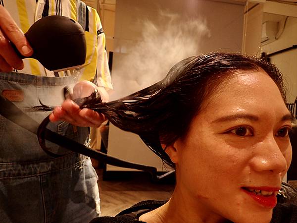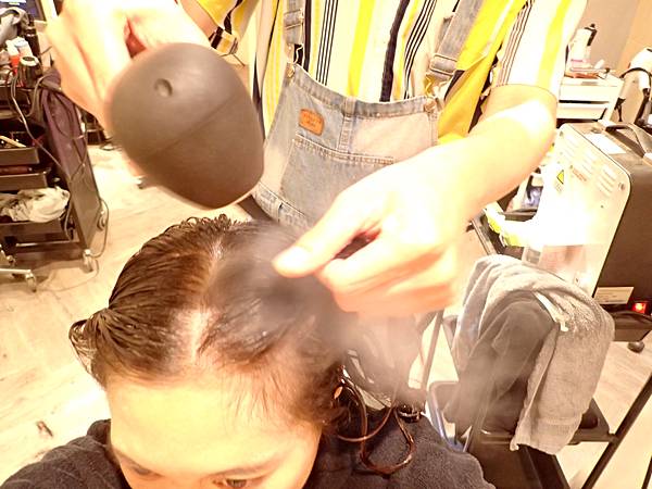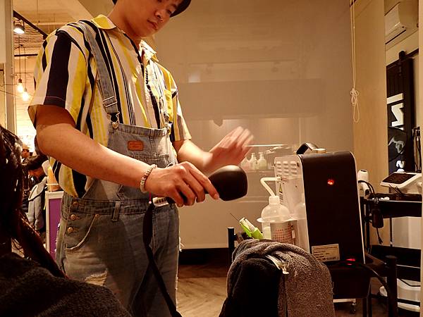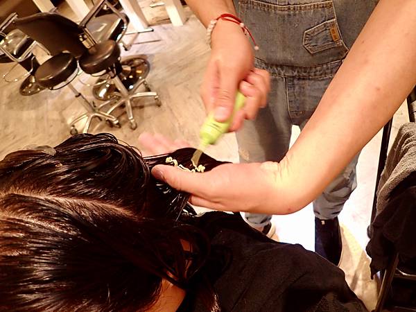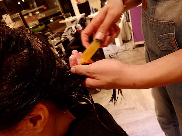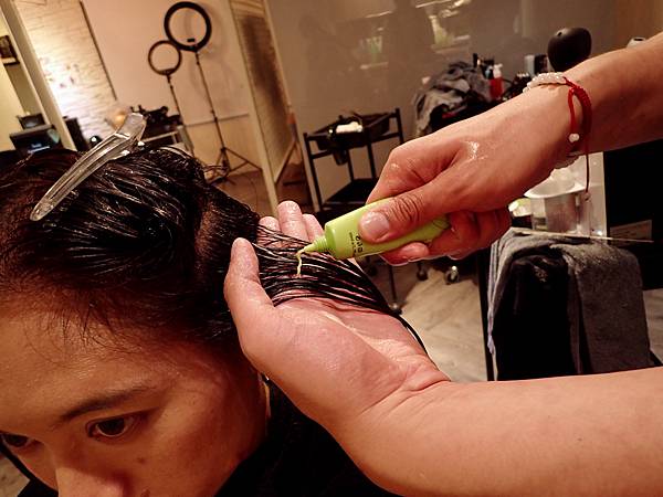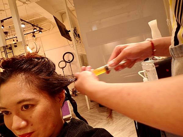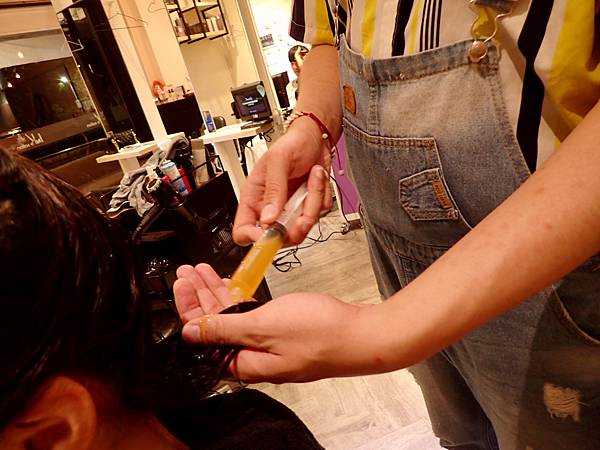 設計師Mark說這種護髮是氨基酸護髮,第一個使用針劑,裡面的氨基酸會幫你找出頭髮的空洞,順便把空洞補起來,這時候會起泡,你也可以透過這個方式來了解哪裡需要補上。