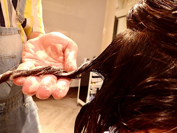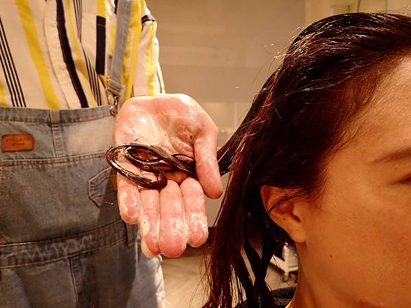 設計師mark也跟我說,這種護髮會起泡,只要頭髮有空洞的地方就會有泡泡,健康頭髮的部分,泡泡就不會很多。