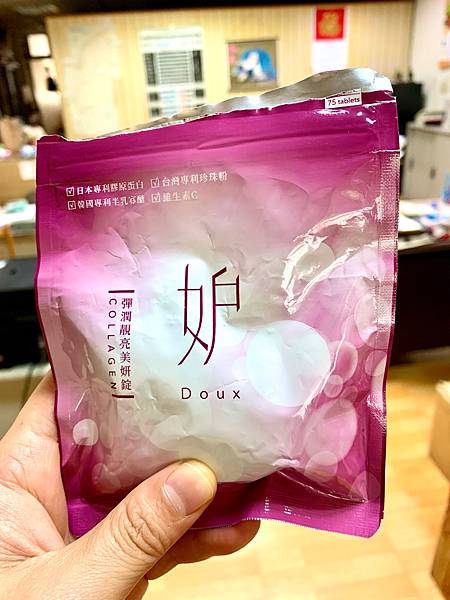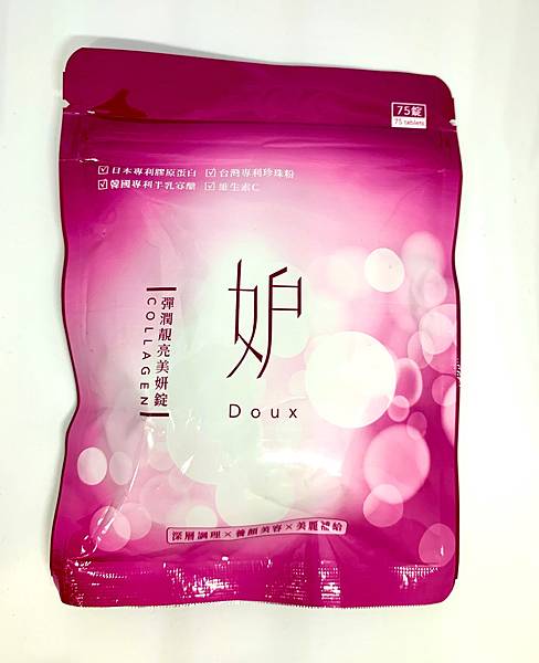 之前也因為曬太陽的關係,讓自己臉上有些小瑕疵,也有補充美白錠,維他命C,但是因為吃太多而覺得好麻煩,就想在網路上搜尋看是否有一包包含有維他命C與膠原蛋白的吃的輔助品,因此就找到Doux妒-彈潤靚亮美妍錠,這一包裡有75粒,1天吃5粒(請勿一天吃超過10粒),總共15天量。