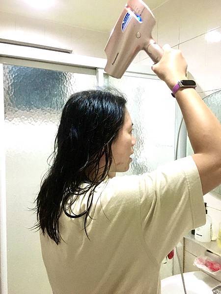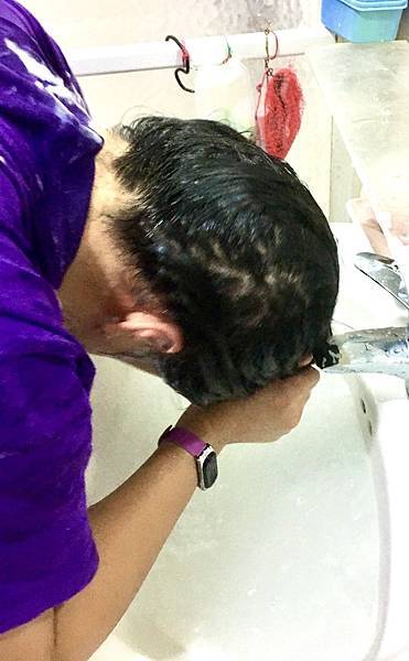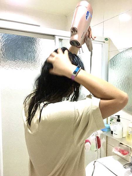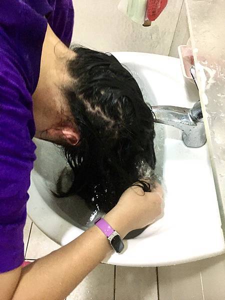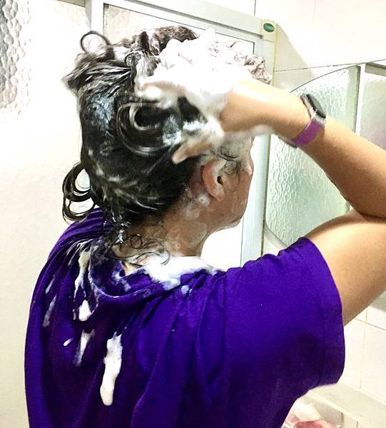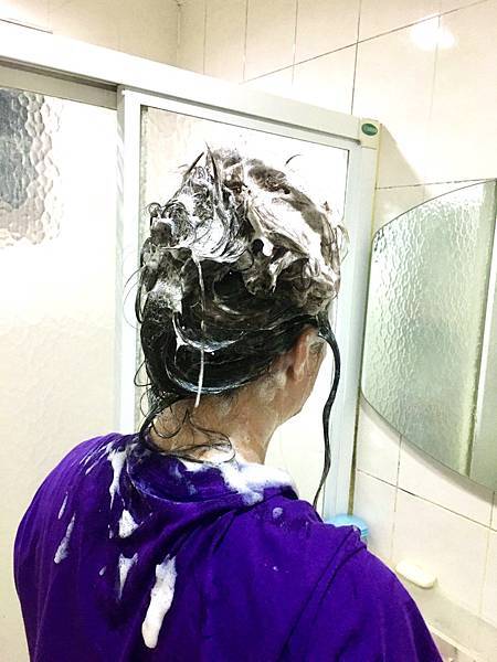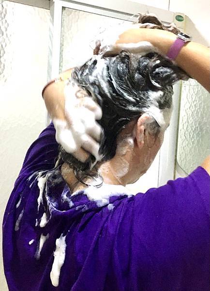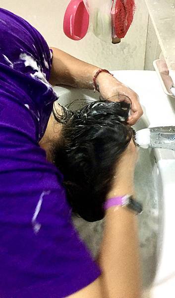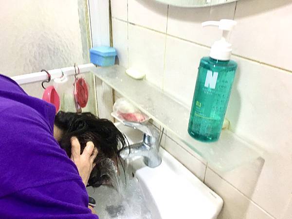 準備洗頭了,我會先把頭髮弄溼,在抹洗髮精到頭髮上。