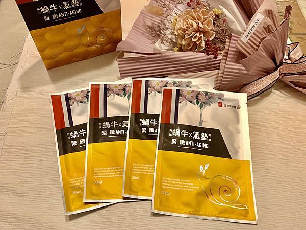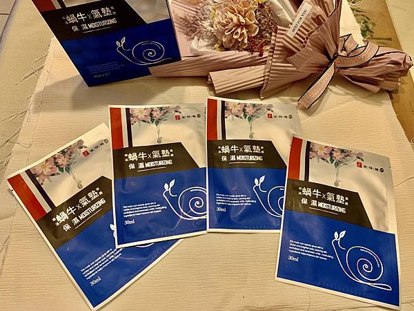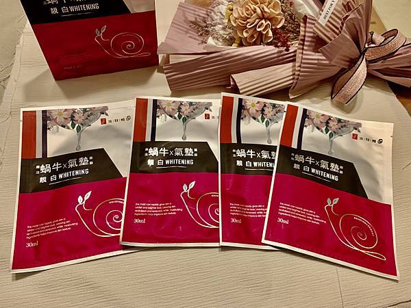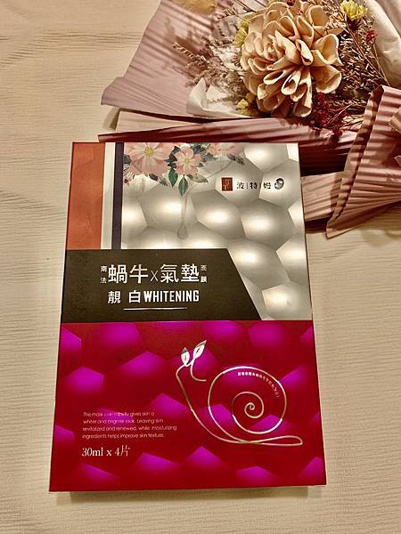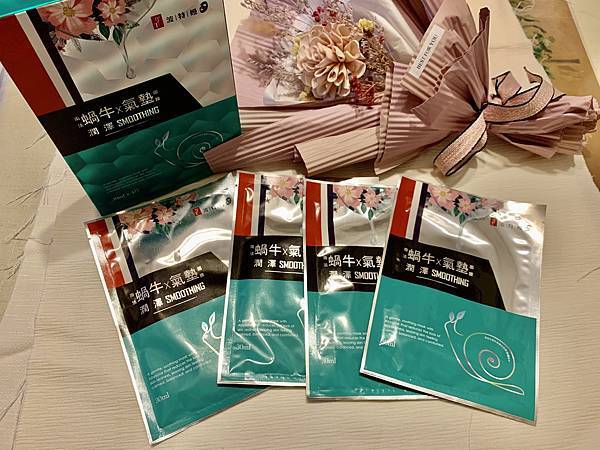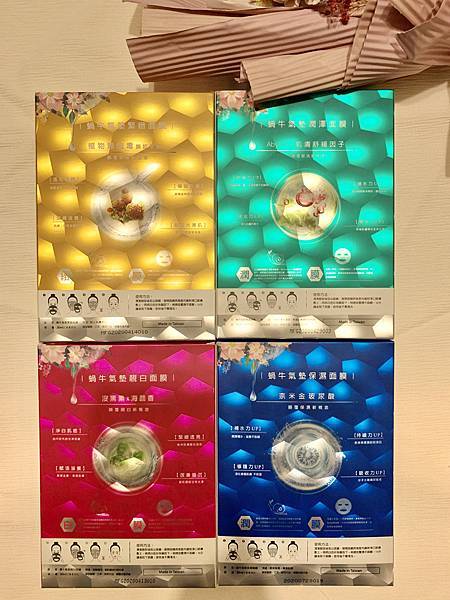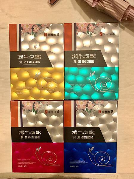 這次入手的TT波特嫚蝸牛氣墊保濕面膜、TT波特嫚蝸牛氣墊緊緻面膜、TT波特嫚蝸牛氣墊靚白面膜與TT波特嫚蝸牛氣墊潤澤面膜4種,一盒裡面有4片面膜,包裝都很美,很漂亮,很貴氣。