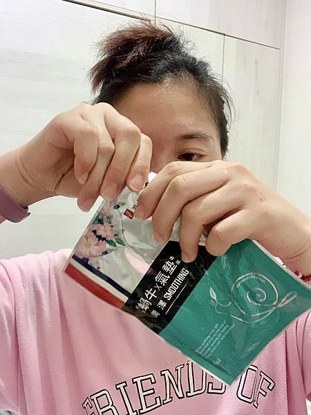 取出一包TT波特嫚蝸牛氣墊保濕面膜,撕開包裝。