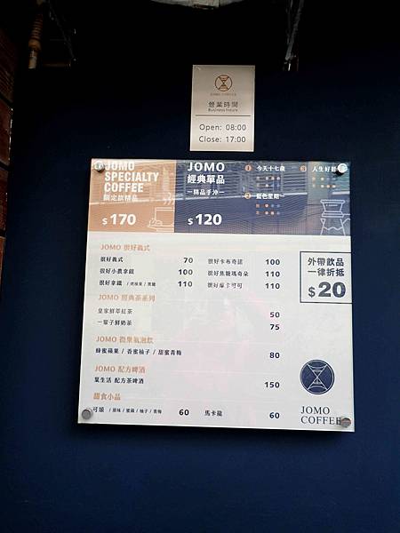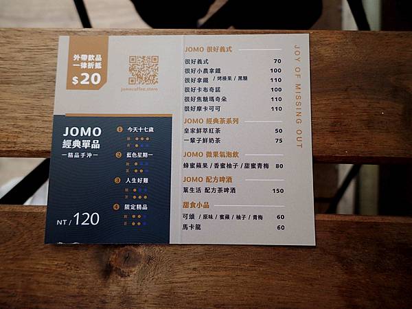 這是Jomo coffee的點餐單,可以選擇內用與外帶,因為是複合式咖啡廳,所以座位不多。