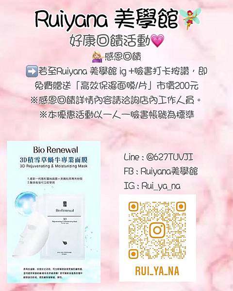 在離開「Ruiyana美學館」之前,美容師很貼心的會在第一次來到「Ruiyana美學館」保養的客人,一張保養卡(平日保養),遵守上面的作法,肌膚會真的很不錯唷!