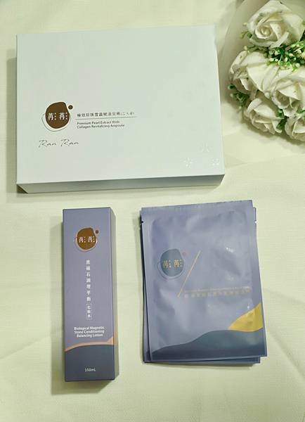 「苒苒」安瓶保養,洗臉後,先上「苒苒」黑磁石調理平衡化妝水之後,敷「苒苒」能量黑磁石混合肌專用面膜後再使用「苒苒」極效珍珠雪晶賦活安瓶。