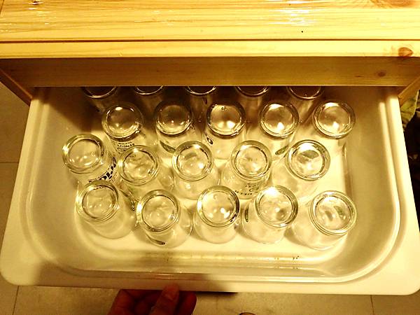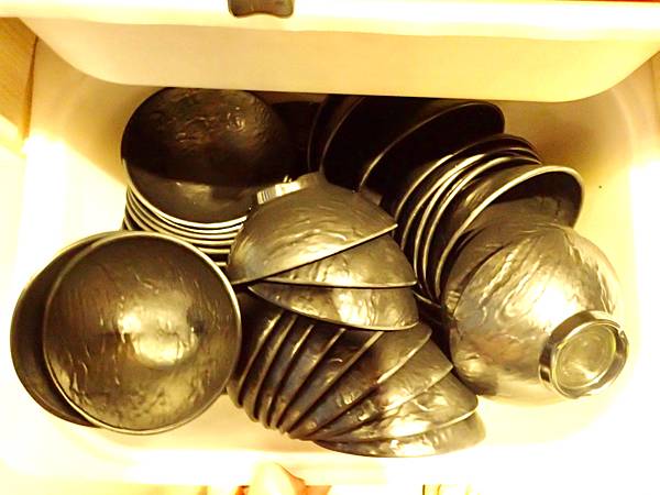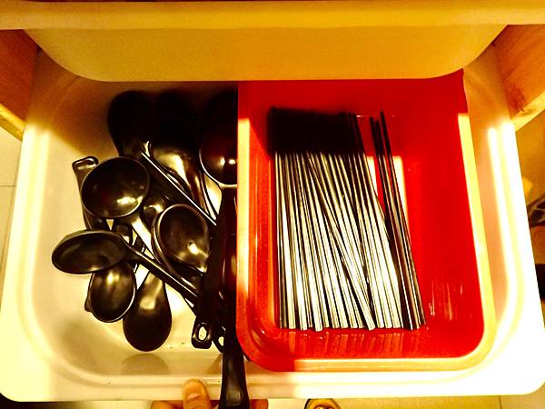 餐具自取區,有三層抽屜(碗、杯子、湯匙、筷子)。