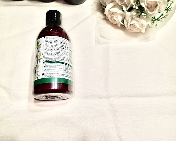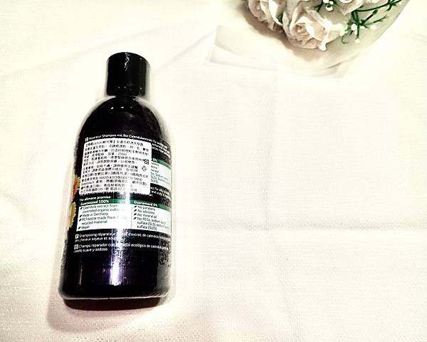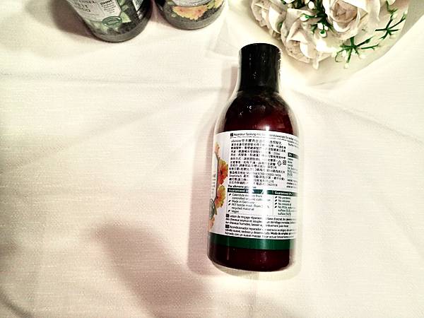 洗髮露洗乾淨後,使用同系列的受損頭髮髮尾使用金盞花修護潤髮乳。