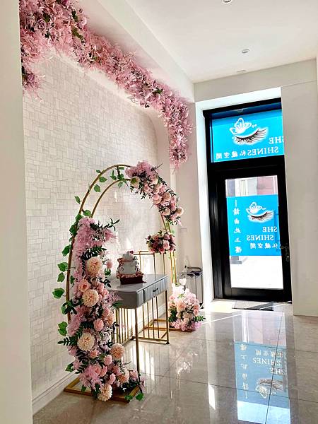 這次回廠的課程是透過網路上看到she shines私藏空間,發現是一家空間很大的美容,位於2樓,一樓進到店裡就超美的,粉色的一樓花卉裝置,超適合網美打卡拍照。