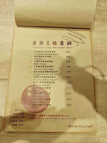 這是姐妹一來到morning mood晨沐早餐店,看到菜單必點的鮪魚高麗菜絲蛋餅,姐妹說,她去早餐店一定會點鮪魚蛋餅,愛吃鮪魚蛋餅的姐妹說,如有一家鮪魚蛋餅讓她滿意,這家早餐店就很棒了。
