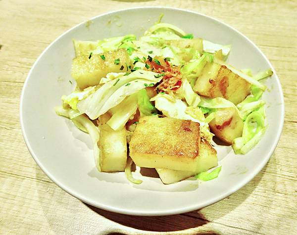 蘿蔔糕鹹度剛剛好,不需要在使用醬油,加上XO醬微辣的調配,讓XO醬跟蘿蔔糕組合在一起,味道融洽,可以吃到蘿蔔糕的原味也不會搶掉味道,XO醬也能吃到它的滋味,搭配好吃的高麗菜,蘿蔔糕與XO醬配上高麗菜是絕配。