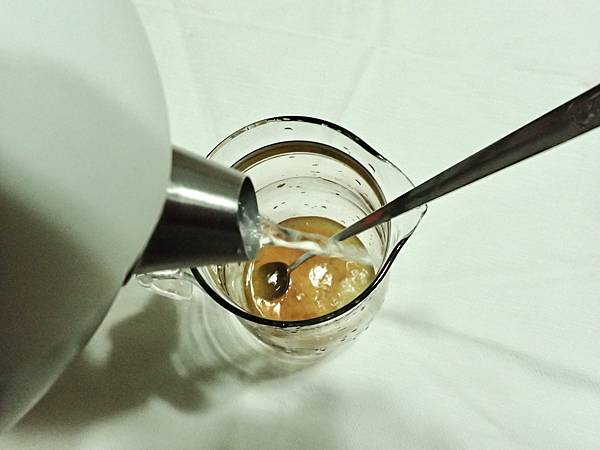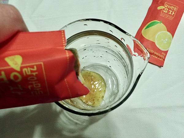 沖泡了!準備杯子,倒入後,先加入一點水,先把柚子醬攪拌勻。