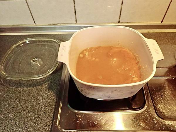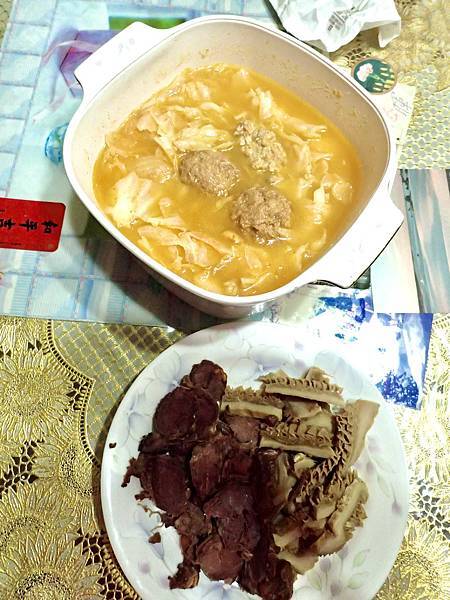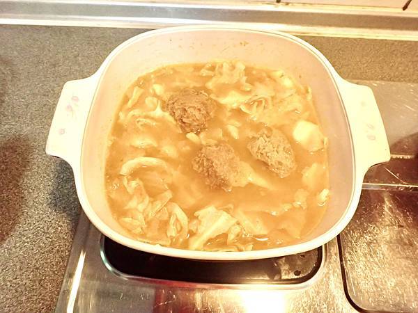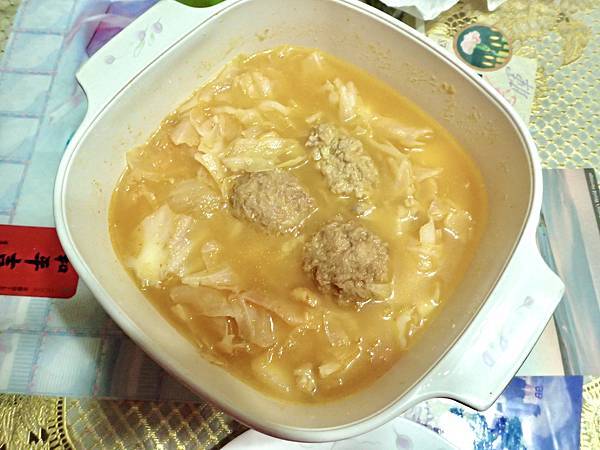 完成了,我的晚餐的湯,「韓國豆渣鍋」裡面有高麗菜跟獅子頭。