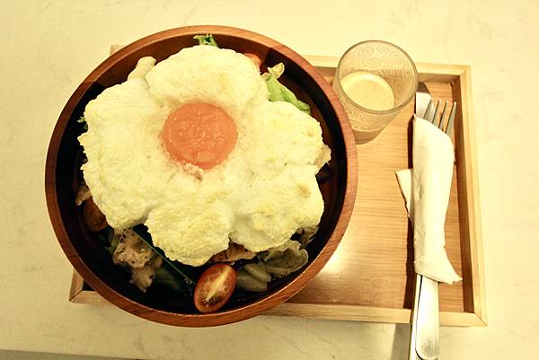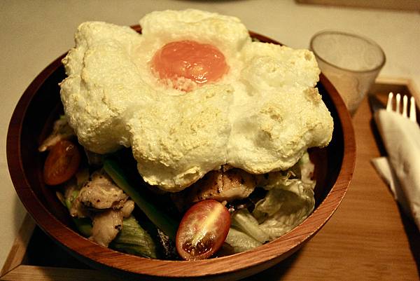 雲朵的白雲部份是蛋白,中間有一顆蛋黃,好像一朵花,雲朵部份綿密好吃,蔬菜沙拉部份,蔬菜香甜、可口,搭配沙拉醬,真是絕配,這個真的必點必推,沙拉裡的魚是新鮮的鯛魚片,完全沒有魚的味道,搭配生菜沙拉,口感搭配上很棒。