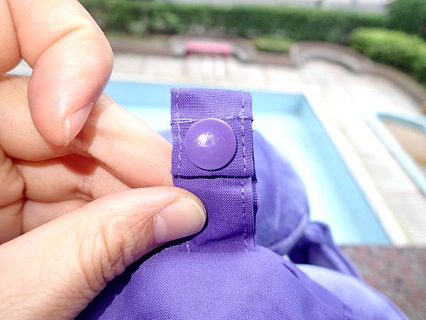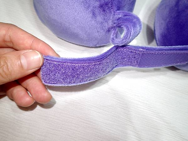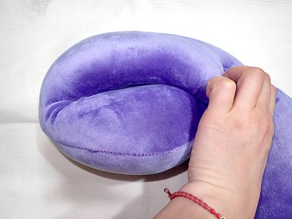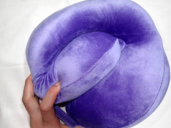 飛買家Travel Blue記憶棉頸枕-紫色,他的穿戴是先掛上脖子,然後把另一條穿過另一條的洞後。