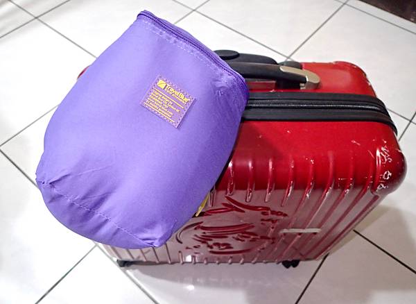 「飛買家Travel Blue記憶棉頸枕」,還可以收納到它附的袋子裡,還可以扣在行李箱上。