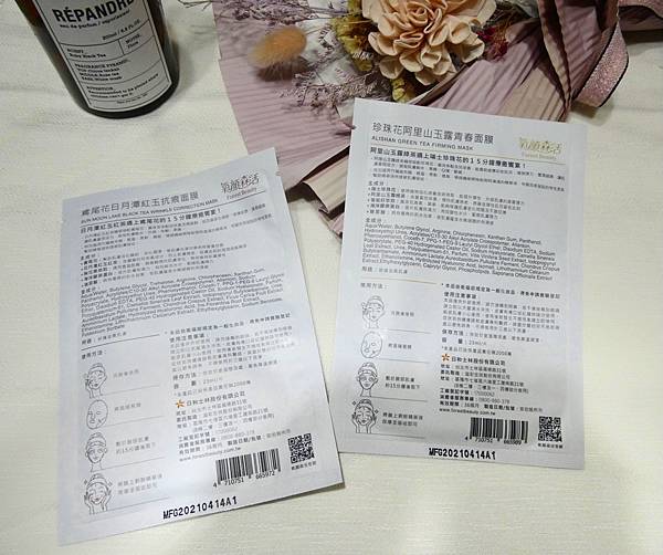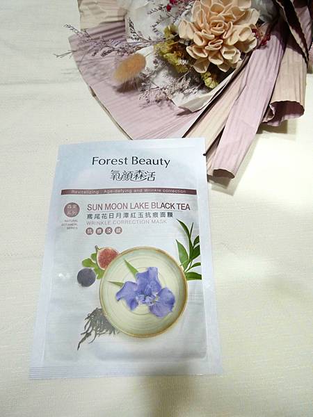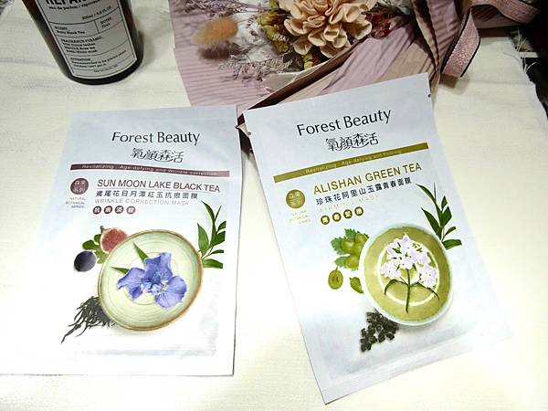 這次跟「氧顏森活」合作,森果面膜系列茶面膜,2款面膜各一片,「鳶尾花日月潭紅玉抗痕面膜」與「珍珠花阿里山玉露青春面膜」。