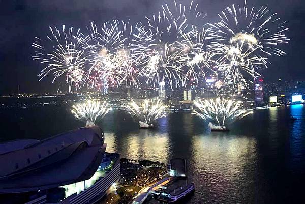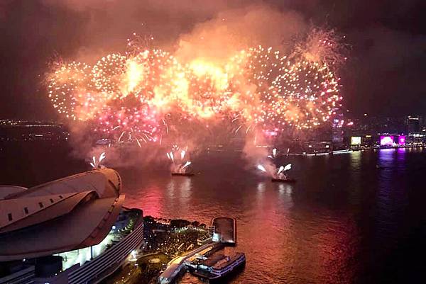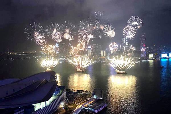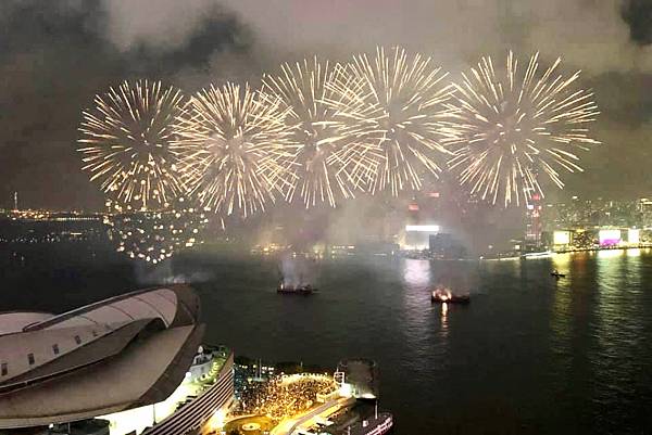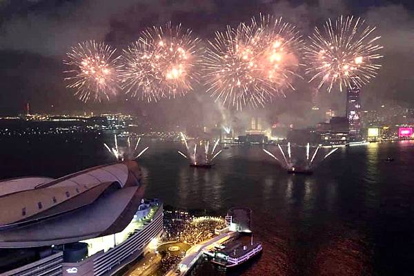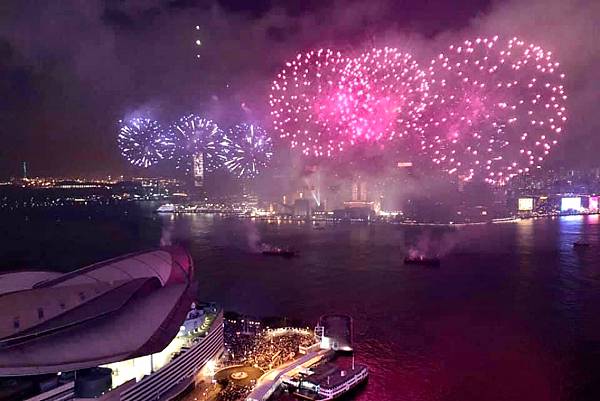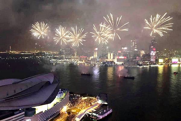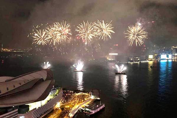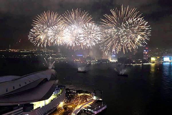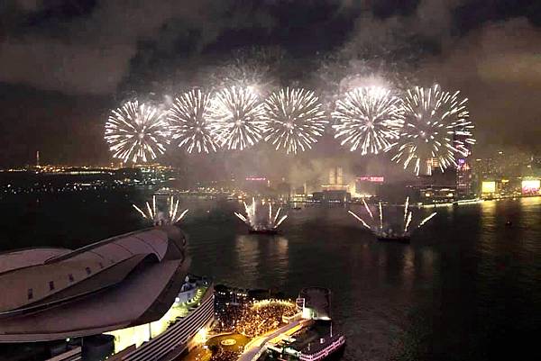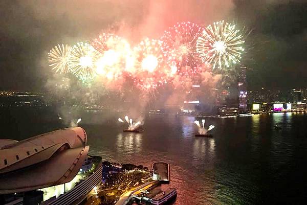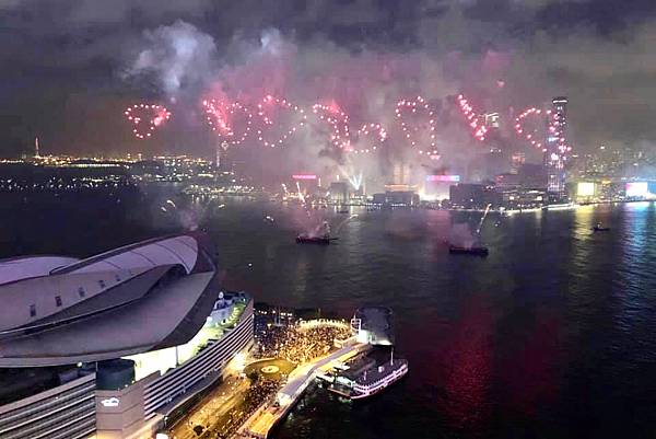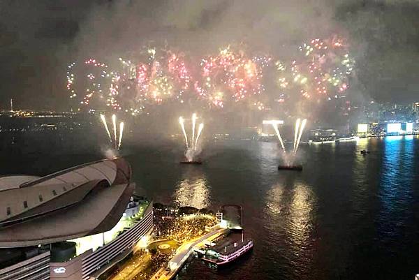 在高樓上看維多利亞港,還有煙火,真的很美,真的很享受。