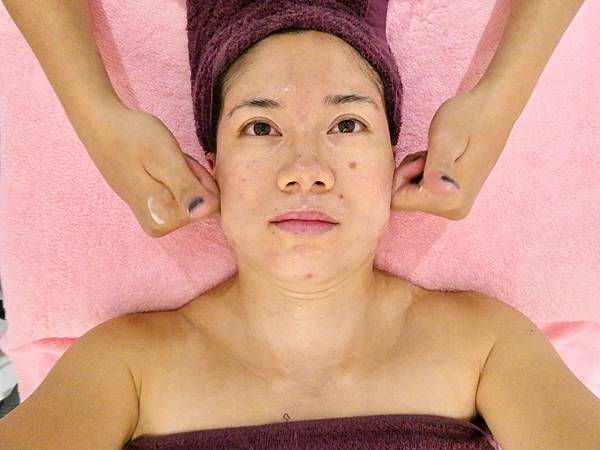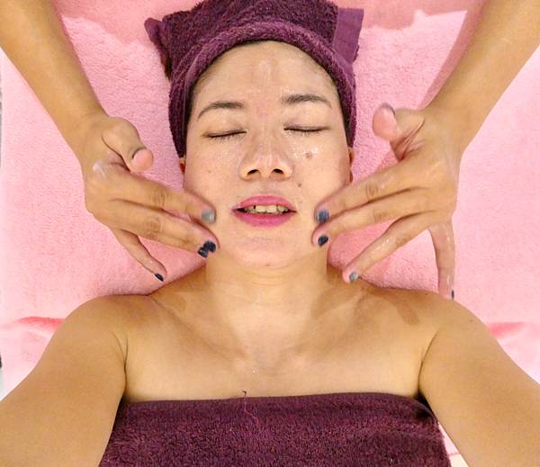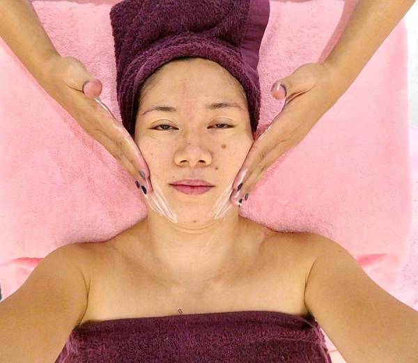 第二步驟:使用美容乳液做「手技」臉部按摩,舒壓、活絡肌膚。