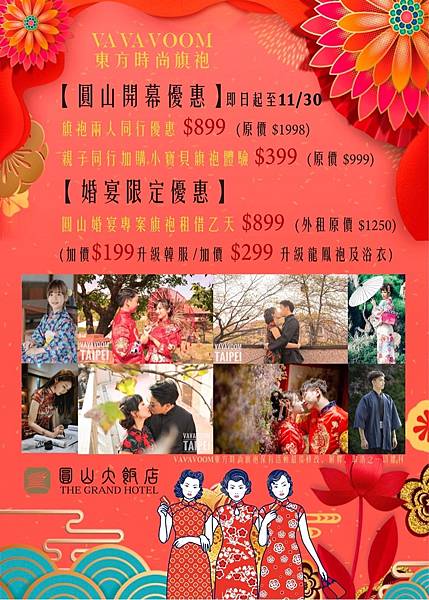 有兩個優惠到2021年11月30日要把握,兩人同行/親子同行/婚宴租借優惠,請詳閱海報,下面附上官網裡面也有些優惠可以參考,也有高雄圓山VAVAVOOM東方時尚旗袍館。