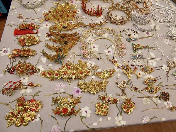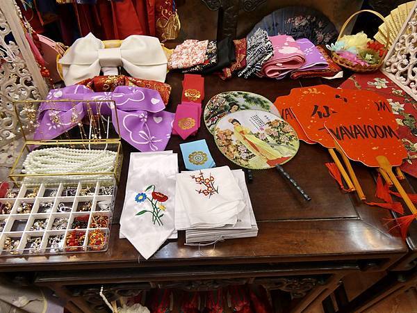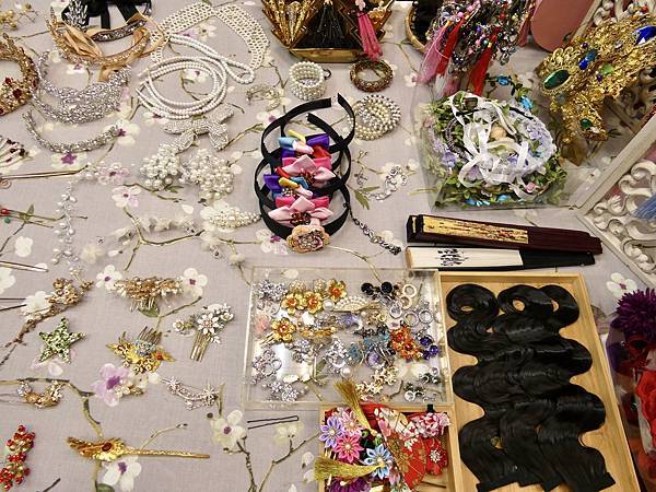 還有很多琳瑯滿目的配件可以選擇在自己頭髮上做裝飾,還有扇子等配件,有些可能需要押金,但現在是開幕期間,飾品、配件不用押金,用壞要賠償,這是一定要的唷!也有可以加價選租更多配件。