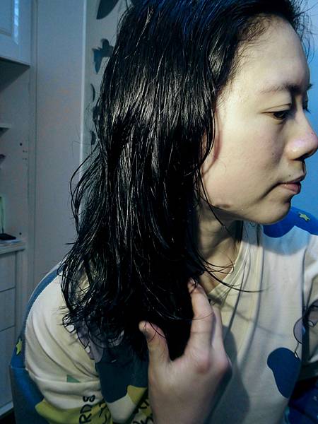 兩手均勻抹開,再往頭髮髮絲上按摩。