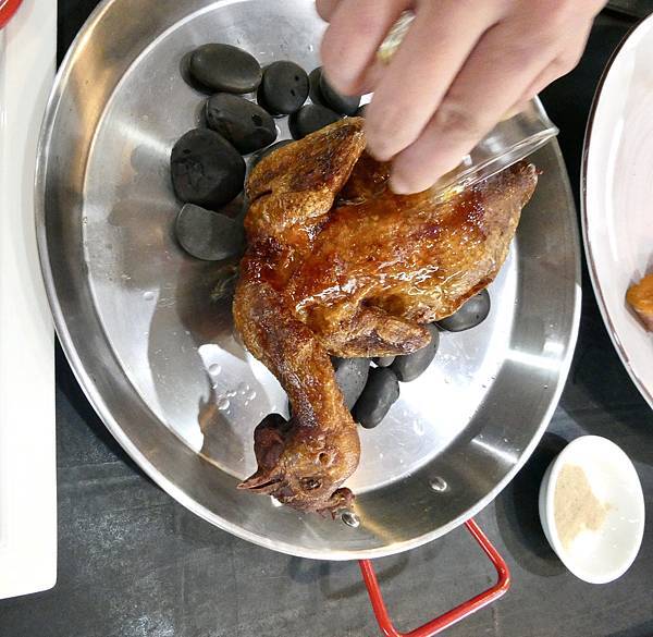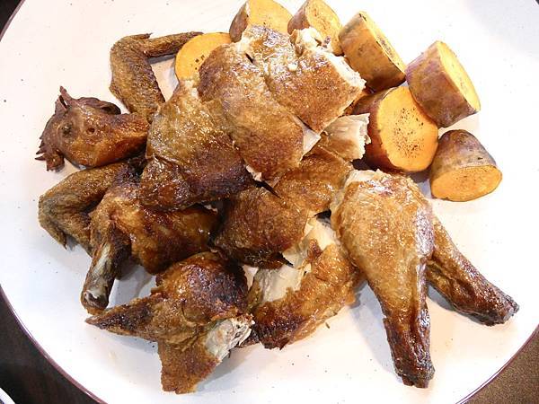 雞肉的皮真的很脆,雞肉經過醃製到入味需要花費兩天的時間,入口的雞肉多汁有醃料的鹹味,不需沾他們附的胡椒鹽就超好吃的,Jessica覺得整個脆皮雞已經很好吃了,其實吃原味就很讚啦!醃製入味,皮脆,調味剛剛好,在淋上威士忌,帶有點威士忌酒香氣,讓脆皮雞口感提升,最後再搭配上台農57號地瓜,甜度剛好的綿密口感,絕配。