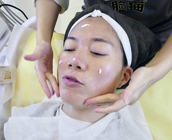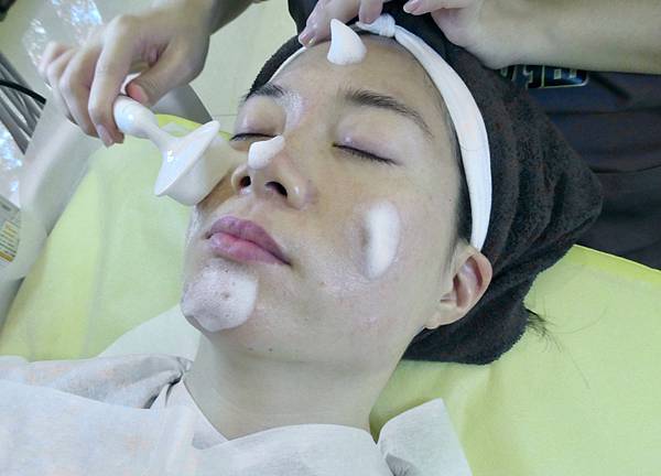 潔顏師先幫Jessica卸除臉上的彩妝與髒污,先做「孔夫仔沖泡」。
