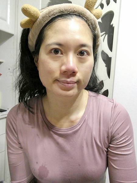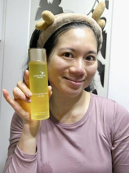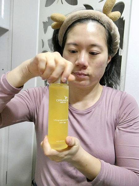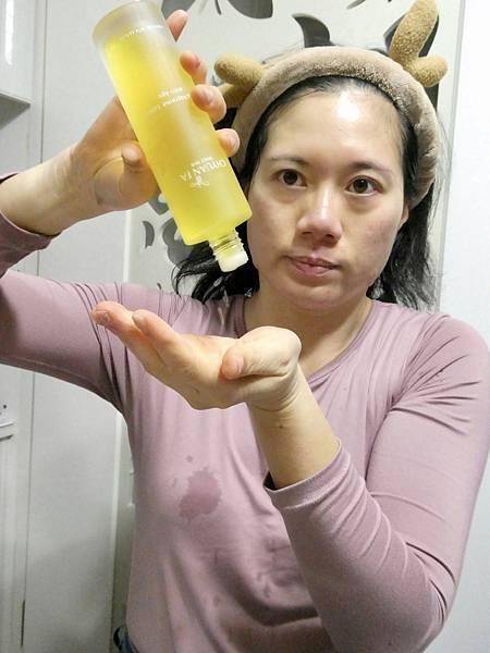 Jessica清潔到保養,化妝水是保養第一步驟,因為是混合肌偏乾,使用化妝水二次、精華液一次,最後乳、霜一次。