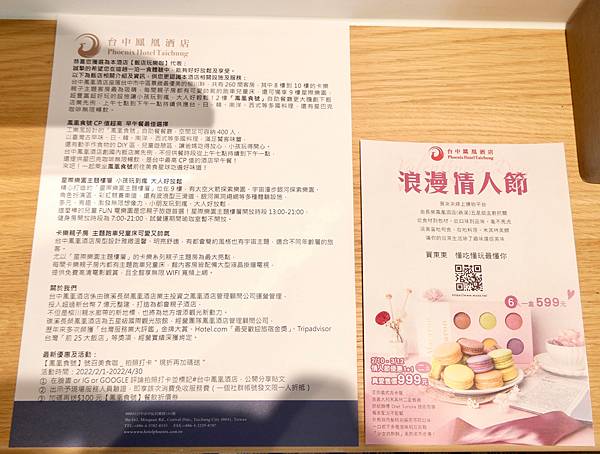 因為我們是2022年2月14日入住,這天剛好是西洋情人節,因此有驚喜發現,「台中鳳凰酒店」很貼心,應景送房客「一盒馬卡龍」太貼心了。