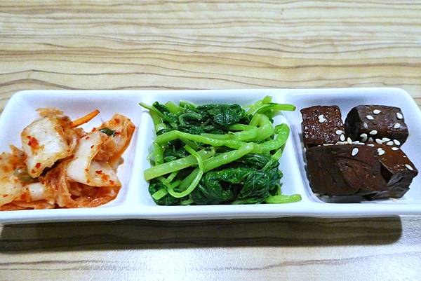 套餐的配菜,這些配菜是(可續)的,配菜-3種。莧菜,帶有脆感、豆乾、微辣的泡菜。