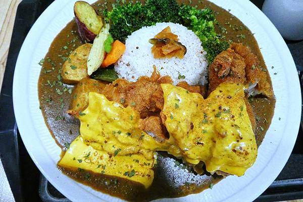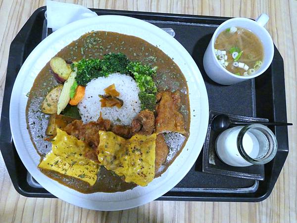 閨蜜點的咖哩套餐,脆雞咖哩套餐+起司,有主餐、甜點、湯,主餐的(紅藜飯、醬料可續),主餐的肉(不可續),甜點(手作奶酪布丁),不可續,味增蔬菜湯(可續)。