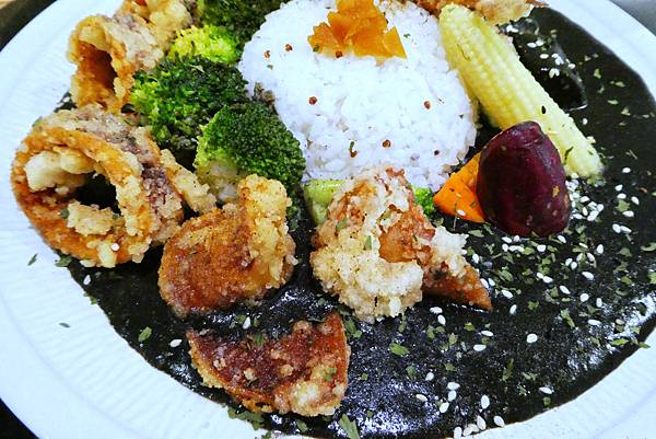 整尾墨魚酥炸,還有加上多樣蔬菜,墨魚醬汁海鮮味咖哩,很特別,墨魚酥脆,很好吃,蔬菜鮮甜,搭配健康的藜麥飯。