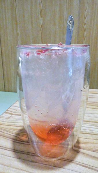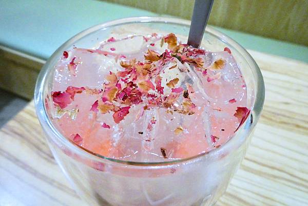 Jessica的配餐飲料,很漂亮。玫瑰莊園泡泡-120元,帶有玫瑰香氣的氣泡水,裡面帶有氣泡水獨特的口感,配上玫瑰糖漿,視覺上帶有漂亮的漸層,喝時請記得攪拌均勻。