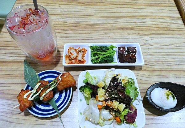 這是我們套餐加價+150元的沙拉、配菜、前菜,還有一顆加價單點的溫泉蛋。