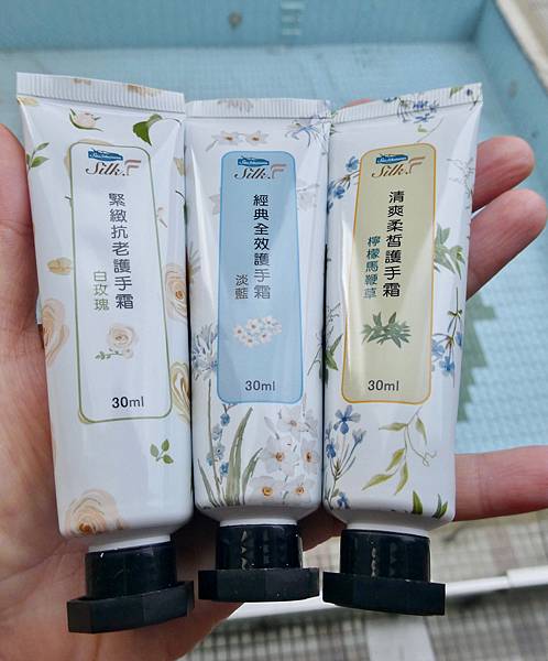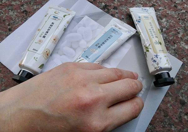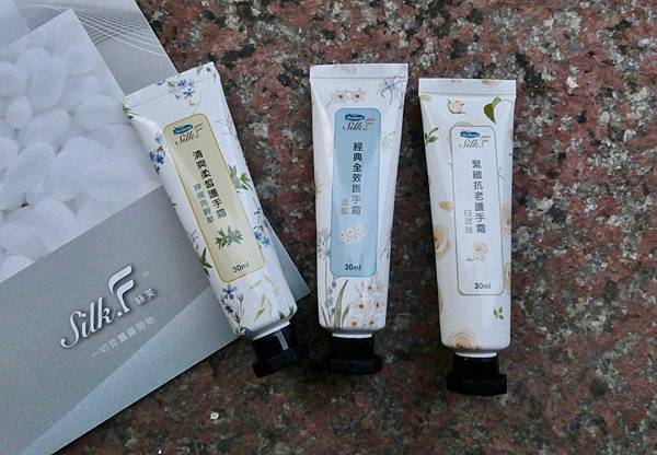 這三支我一支放包包一支放辦公室一支放家裡房間裡,我使用幾天後,感覺很滋潤,以往洗手都會手乾,可能洗一次手就要使用護手霜一次,但因為這支添加了水解蠶絲蛋白,讓我覺得不用每次洗手都使用護手霜,可以洗兩三次使用一次,還有一種用法我一定要推,睡覺時我會拿護手霜厚塗在手上,戴上專用手套去睡覺,第二天早上手呈現的肌膚是漂亮的。